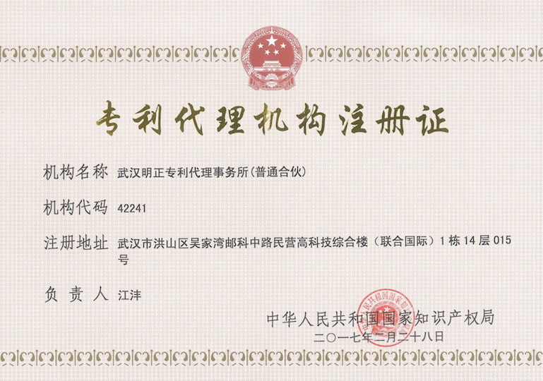 明上知識產(chǎn)權配合國家專利局的工作,于2017年2月28日,正式成立明正專利代理事務所,并且已在國家專利局備案,取得專利代理機構(gòu)注冊證。旨在培育一批專業(yè)化、國際化的知識產(chǎn)權服務者,為市場主體和創(chuàng)新主體的知識產(chǎn)權發(fā)展提供有效支撐和保障,也為明上的新老客戶提供更專業(yè)更優(yōu)質(zhì)的專利代理服務!