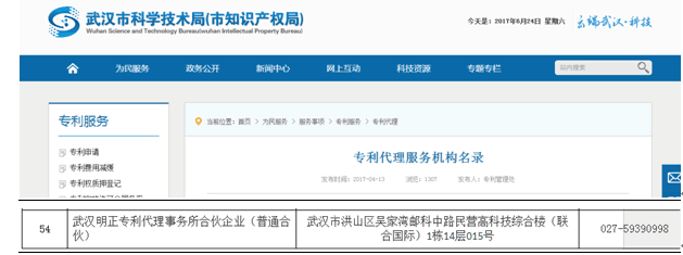 如:小編在網(wǎng)上搜索到一家代理機(jī)構(gòu)的名稱為“武漢明正專利代理事務(wù)所”,我想確認(rèn)這家企業(yè)是否為國家認(rèn)可的專利代理服務(wù)機(jī)構(gòu),小編進(jìn)入“武漢市科學(xué)技術(shù)局”,查詢?nèi)缦拢?/span>