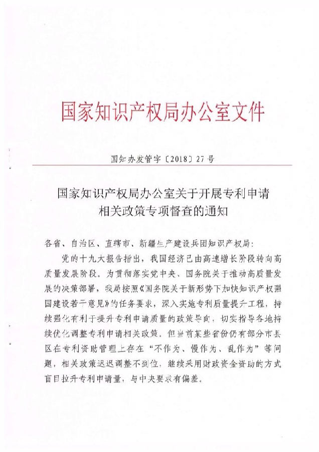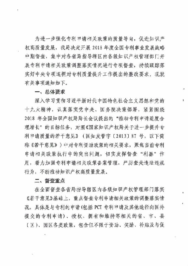 深入學習貫徹習近平新時代中國特色社會主義思想和黨的十九大精神,認真落實黨中央、國務院決策部署,緊緊圍繞2018年全國知識產權局局長會議提出的“推動專利申請適度合理增長”的目標任務,對照《國家知識產權局關于進一步提升專利申請質量的若干意見》(國知發(fā)管字〔2013〕87號,以下簡稱《若干意見》)中對專利資助政策的相關要求,聚焦當前專利申請相關政策執(zhí)行中的突出問題,切實發(fā)揮督查“利器”作用,著力加強專利申請相關政策備案管理,嚴厲查處違法違規(guī)行為,不斷推動知識產權高質量發(fā)展。