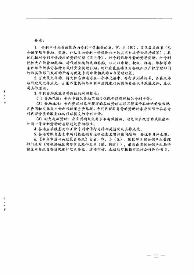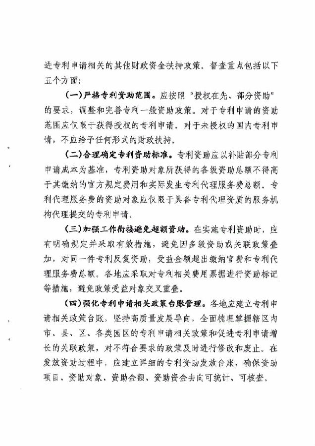 在全面督查各省局指導轄區(qū)內各級知識產權管理部門落實《若干意見》基礎上,重點督查專利申請相關政策的調整落實情況,具體是與專利的申請(包括PCT專利申請及其他途徑向國外提交的專利申請)、授權、擁有和維持等相關的省、市、縣(區(qū))、園區(qū)各類政策,包含但不限于資助、獎勵、補貼及與促進專利申請相關的其他財政資金扶持政策。督查重點包括以下五個方面: