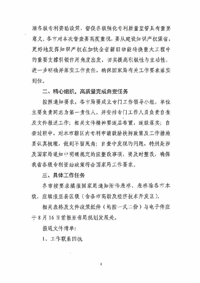 (一)全面自查。各省局圍繞2018年全國知識產權局局長會議部署和要求,對照上面五個方面督查重點,從接到本通知之日起開展全面自查,梳理政策措施落實情況,查找工作中存在的主要不足和突出問題,有針對性地提出整改措施以及完善政策措施的工作建議。各省局應組織轄區(qū)內各級知識產權管理部門于8月20日前完成專利申請相關政策自查(自查要求參見附件3),并對各級自查情況進行匯總登記和建檔復核。各省局統(tǒng)計轄區(qū)內各級專利申請相關政策及執(zhí)行情況后按要求及時報送我局。我局將對自査情況的匯總登記和建檔復核情況進行全面核查和實地抽查。